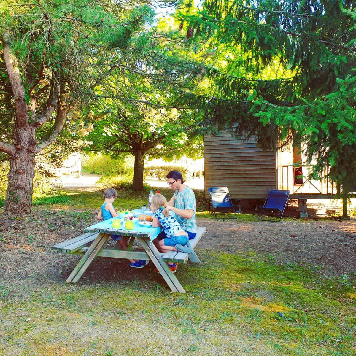 Wij sliepen in een Lodge, een houten stacaravan. Deze liggen tussen heerlijk ruikende naaldbomen, waardoor je zowel in de zon als de schaduw kunt zitten. Bij ons was het prachtig weer, we aten iedere dag aan de picknicktafel onder de naaldbomen. De Lodge heeft een barbecue en een grote koelkast, fijn als je allemaal lekkere dingen in de supermarché hebt gehaald.