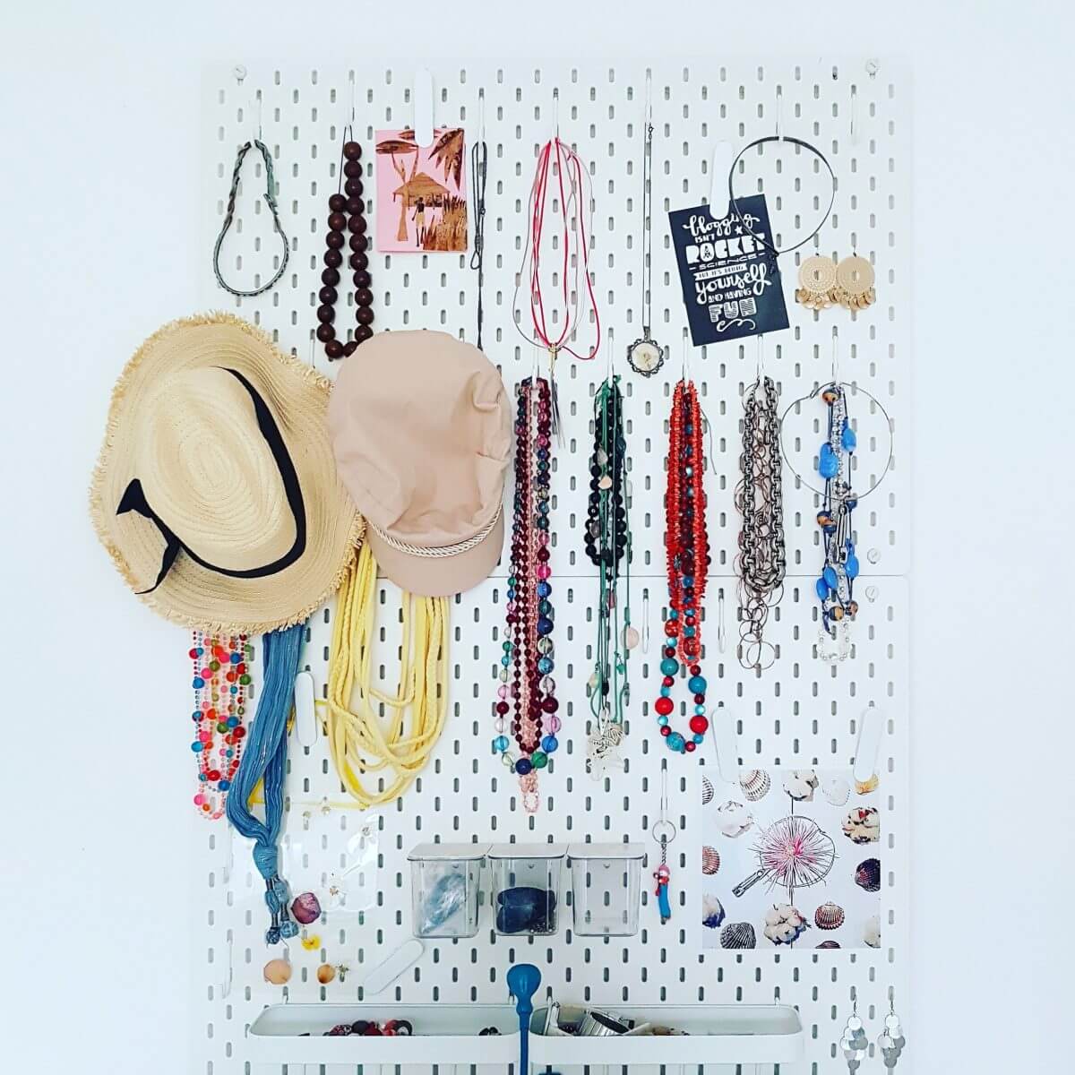 Het pegboard gebruikte ze om tekenspulletjes in op te bergen, maar ook om mooie kaartjes en foto’s op te hangen.