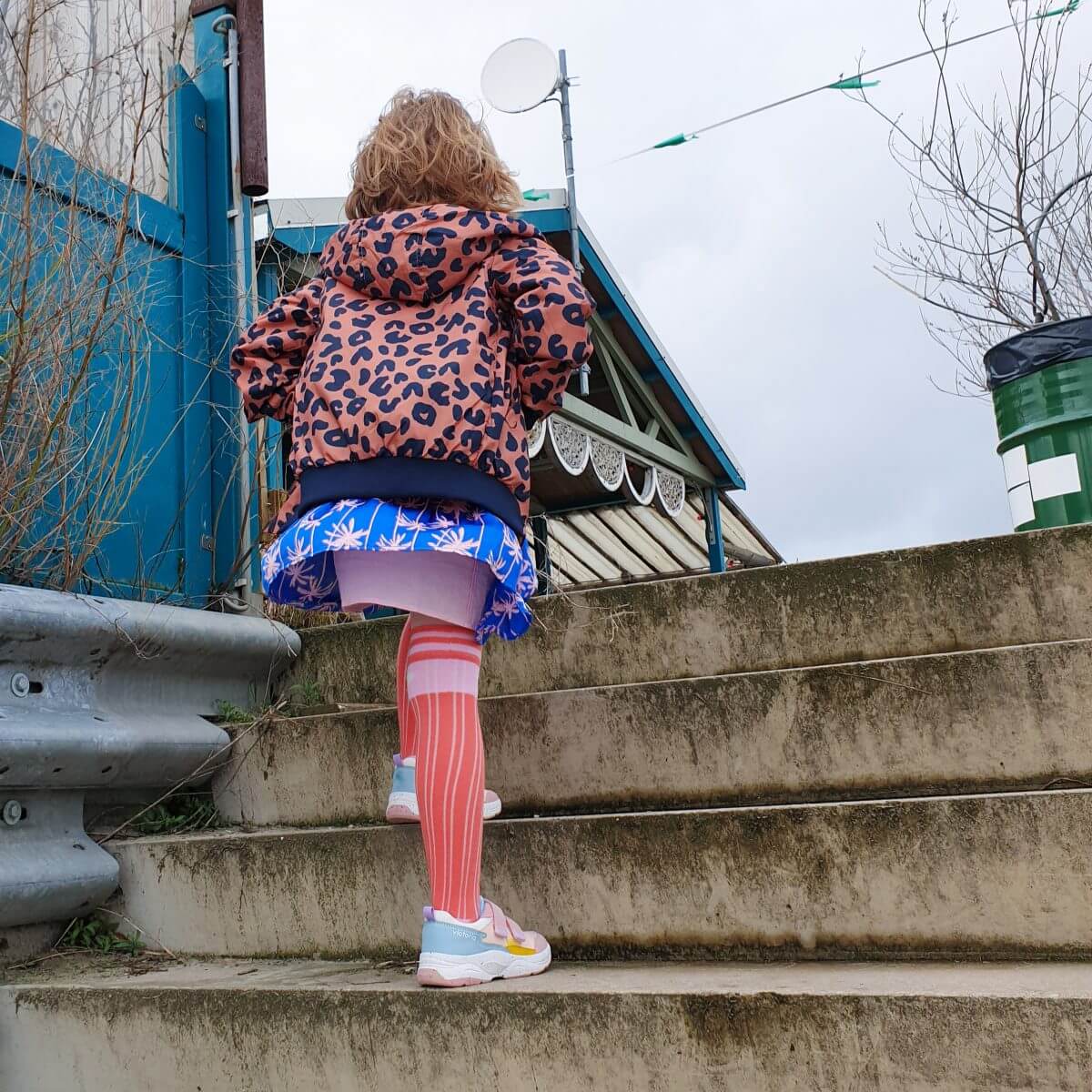 Het jasje dat kleine meis aan heeft is zo´n jasje van 100% gerecycled polyester. Bovendien is het aan twee kanten draagbaar, twee jasjes in één dus. Onder het jurkje met de palmbomenprint heeft ze extra lange kniekousen, fijn als het ‘s ochtends toch nog een beetje fris is. Ook fijn met een panty eronder, als je niet kan wachten op de lente ?