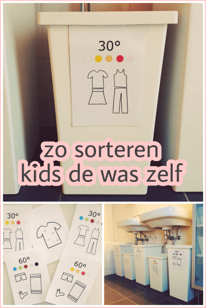 De meeste kinderen willen heel graag hun eigen kleding in de wasmand gooien, maar de juiste wasmand kiezen is best ingewikkeld. Als je ze dan naroept “de zestig graden was”, dan wordt het er niet makkelijker op. Daarom bedacht ik een organizing systeem om het makkelijker te maken. Hierdoor kunnen de kinderen nu heel makkelijk zelf hun was sorteren in de gemarkeerde wasmanden.