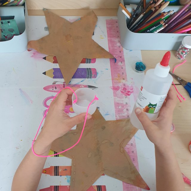 Onze mod podge was glimmend, zodat de ster ook een beetje glimt. Als lichtje gebruiken we een fietslampje, dat kun je er voorzichtig in stoppen.