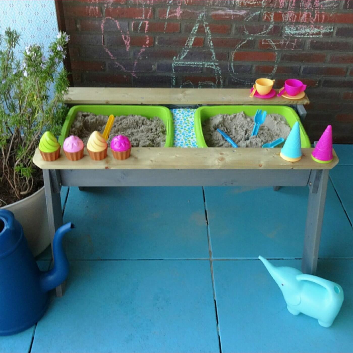 Ideaal: een watertafel en zandtafel, bijvoorbeeld deze van Exit. Bij Bol.com vind je er heel veel, zowel van hout als van plastic. Het cupcake setje is van Androni en te koop bij Bol.com, de ijsjes zijn te koop bij Bol.com. De grote gieter is de koffiepot Xala Lungo.